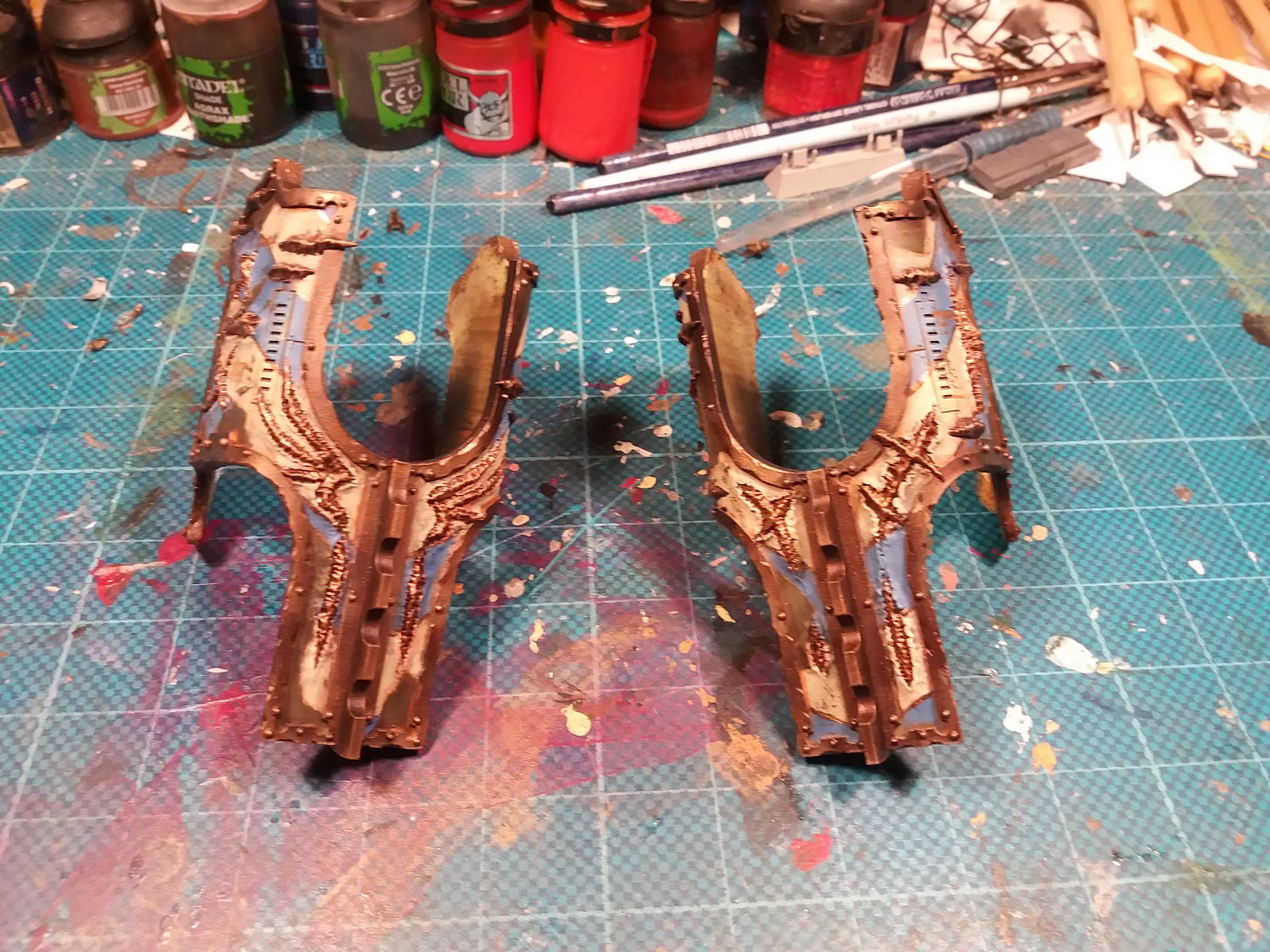 As for the carapace of the laser blaster it turned out a bit messy with the flaked chevrons and the bone breaking through the armour. This made me a bit unsure about my plans to have the shoulder plates also with blue white chevrons... will see how it turns out. Only fore pieces left to go.